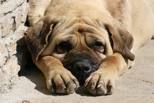drbání. Anglický mastif zbožňuje drbání na bříšku, zvláště když se může